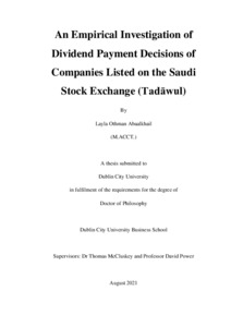 Abaalkhail, Layla Othman (2021) An empirical investigation of dividend payment decisions of companies listed on the Saudi stock exchange (Tadāwul). PhD thesis, Dublin City University.
