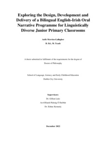 Merrins-Gallagher, Aoife (2023) Exploring the design, development and delivery of a bilingual English-Irish oral narrative programme for linguistically diverse Junior Primary classrooms. PhD thesis, Dublin City University.