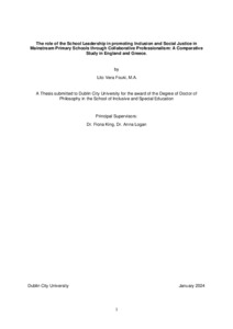 Fouki, Lito Vera (2024) The role of the school leadership in promoting inclusion and social justice in mainstream primary schools through collaborative professionalism: a comparative study in England and Greece. PhD thesis, Dublin City University.