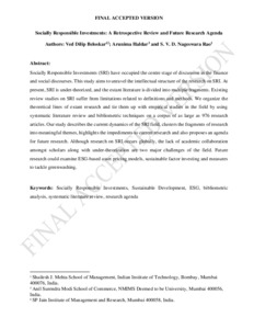 and social discourses. This study aims to unravel the intellectual structure of the research on SRI. At present, SRI is under-theorized, and the extant literature is divided into multiple fragments. Existing review studies on SRI suffer from limitations related to definitions and methods. We organize the theoretical lines of extant research and tie them up with empirical studies in the field by using systematic literature review and bibliometric techniques on a corpus of as large as 976 research articles. Our study describes the current dynamics of the SRI field, clusters the fragments of research into meaningful themes, highlights the impediments to current research and also proposes an agenda for future research. Although research on SRI occurs globally, the lack of academic collaboration amongst scholars along with under-theorization are two major challenges of the field. Future research could examine ESG-based asset pricing models, sustainable factor investing and measures