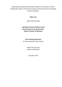 Love, Máire (2024) Exploring key educational stakeholders experiences of school-to-school collaboration within a professional learning community (PLC) for developing inclusive education. Doctor of Education thesis, Dublin City University.