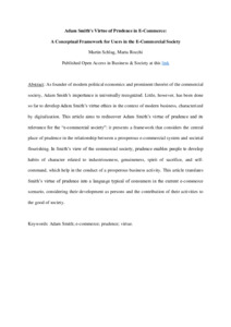 As founder of modern political economics and prominent theorist of the commercial society, Adam Smith’s importance is universally recognized. Little, however, has been done so far to develop Adam Smith’s virtue ethics in the context of modern business, characterized by digitalization. This article aims to rediscover Adam Smith’s virtue of prudence and its relevance for the “e-commercial society”: It presents a framework that considers the central place of prudence in the relationship between a prosperous e-commercial system and societal flourishing. In Smith’s view of the commercial society, prudence enables people to develop habits of character related to industriousness, genuineness, spirit of sacrifice, and self-command, which help in the conduct of a prosperous business activity. This article translates Smith’s virtue of prudence into a language typical of consumers in the current e-commerce scenario, considering their development as persons and the contribution of their activities to the good of society.