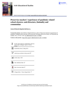Initial Teacher Education (ITE) can be viewed as a formative space in professional teacher identity development. Practice plays a key role in shaping teacher identity, providing a window into the reality of school life, as well as nurturing professional autonomy. Due to the Covid-19 pandemic, school life shifted suddenly and unrecognisably in March 2020. This paper focuses on the experiences of preservice teachers on an ITE programme (post-primary) in one Irish University during the period of sudden school closures. The data show the transition to be problematic, underscored by a chaotic pivot to virtual communication and a destabilising of the structures that normally provide consistency. Yet it also presented opportunities and responsibilities. We explore Victor Turner’s work to consider school placement as an ‘in between’ space for preservice teachers and to examine the extent to which sudden school closures heightened this sense of ‘in betweenness’. We argue that the pandemic and its lifting out of pervasive and predictable social structures, gave rise to a period of ‘anti-structure’. We view school closures as an example of anti-structure, which challenged preservice teachers’ identity formation yet also gave rise to ‘communitas’ through experimentation with different modes of being and doing.