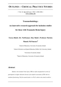 voice to the voices of others and examine the lived experience of students with the same condition to identify possible supports that would enhance inclusion in higher education. This research was driven by the desire to illuminate both the hidden nuances of personal experience (hence the use of autoethnography) and to highlight the lack of research about educational participation of TBI survivors. The analysis was from both professional and personal perspectives. Through an examination via an iterative and interconnected research process, the authors explored the question, what are the supports for participation and access for students with TBI in higher education considering the first author’s experiences. Traditional research might provide generalizable data but may not facilitate deep illumination of experience and voice. This examination transcended traditional research and comprised Students with traumatic brain injury (TBI) are often marginalized in terms of participation in higher education because of an implicit association of TBI with less academic functioning. The first named author is a Ph.D. scholar who aimed to add her autoethnographic and interview-based inquiry. It challenged the research team to consider different perspectives and to interrogate their own interconnections in the same engagement while working towards the same goal. The concept of transmethodology will be discussed regarding the development of multiple perspectives that can assist in transgressing the common divisions in the theory and practice divide and explores knowledge of marginalization regarding participation for students with TBI. This paper argues for the importance of innovations such as transmethodology when researching deeply personal phenomena.