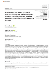 Moore, Gwen, O’Flynn, John, Burgess, Frances and Moore, Jayne (2025) Challenges for music in initial teacher education and in schools: Perspectives from music teacher educators in Ireland and Northern Ireland. Research Studies in Music Education, 47 (1). pp. 17-32. ISSN 1834-5530