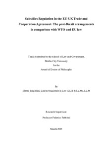 This PhD thesis deals with the subsidy control regime established by the Chapter 3, Title XI of the EU-UK Trade and Cooperation Agreement (TCA). Since 1 January 2021, the UK has fully left the EU regulatory system. The consequence of Brexit is that EU state aid rules no longer apply in the UK in terms of funding and other forms of support measures granted to businesses by public authorities. The only exceptions to this are set in the Ireland/Northern Ireland Protocol. The TCA, entered into force on the 1st of May 2021, whereby, the EU and the UK have agreed upon rules designed to ensure a level playing field for open and fair competition and sustainable development. In particular, the TCA has the most extensive set of provisions on subsidies seen in any free trade