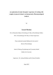 Meehan, Gerard (2025) An exploration of senior therapists’ experience of working with complex trauma in Ireland: An Interpretative Phenomenological Analysis. Doctor of Psychotherapy thesis, Dublin City University.