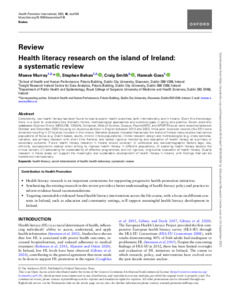 databases (Science Direct, MEDLINE, CINAHL Complete, Web of Science, Scopus, PsychoINFO, and SPORTDiscus) were searched between October and December 2023 focusing on studies published in English between 2013 and 2023. Initial peer reviewed records (N = 551) were screened resulting in 37 studies included in this review. Narrative analysis indicated that across the island of Ireland many studies had narrow populations of focus (e.g. Dublin based, adults, chronic illness populations), limited research design and methodologies (e.g. cross-sectional, narrative, and primary research with short time frames), and lacked rigorous monitoring and evaluation of health literacy as a primary or secondary outcome. Future health literacy research in Ireland should consider: (i) contextual and sociodemographic factors (age, sex,