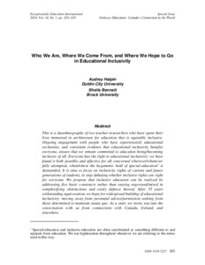 Halpin, Audrey and Bennett, Sheila (2024) Who We Are, Where We Come From, and Where We Hope to Go in Educational Inclusivity. Exceptionality Education International (Online), 34 (1). pp. 202-228. ISSN Exceptionality Education International (Online)