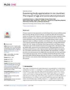 Hanson, Louise, Walker, Catherine, Gott, Alexis, Tomsett, Megan, Useh, Elozino, Yeadon-Caiger, Eloise, Clay, Rachel, Fan, Jiamin, Hui, Kennice, Wang, Hongdi, Evans, Elizabeth Helen, Cowie, Dorothy and Boothroyd, Lynda Gaynor (2024) Examining body appreciation in six countries: The impact of age and sociocultural pressure. PLoS One, 19 (7). e0306913. ISSN 1932-6203