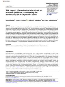 Ivannikova, Viktoriia, Stosiak, Michał, Karpenko, Mykola and Maskeliūnaitė, Lijana (2025) The impact of mechanical vibrations on pressure pulsation, considering the nonlinearity of the hydraulic valve. Journal of Low Frequency Noise Vibration and Active Control, 44 (2). pp. 706-719. ISSN 2048-4046