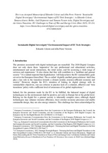 This chapter aims to examine the environmental impact of EU technological strategies, ultimately challenging the idea that the Union is concretely envisaging a really sustainable form of digital sovereignty, in particular, by neglecting the consequences of digital policies beyond its borders. We start by tracing the genealogy of the digitalisation and green strategy in the EU, explaining to what extent they are currently considered as two ‘twin’ policies (II). We then focus on EU technology strategies, analysing how digital sovereignty has recently become a guiding principle in the context of a broader EU quest for strategic autonomy from third countries. Despite not being univocally defined, we illustrate how digital sovereignty strategies concretely take a ‘centripetal’ or a ‘centrifugal’ approach (III). The core contribution of our chapter then lies in the analysis of the environmental impact of EU technological policies as oriented by the EU objective of achieving a status of digital sovereignty. We will identify the generation of a rebound effect as the symptom of a ‘digital insularity’ attitude, where the EU still conceives the digital and green transitions as two siloed policies in terms of effects. We will finally introduce the concept of ‘environmental sovereignism’ to denote the adoption of a ‘Europe first’ attitude in setting twin transition strategies, which de facto neglects the impact of EU policies beyond its borders (IV). The last section will conclude presenting the theoretical alternative of starting to pursue a more digitally ‘sober’ approach (V).