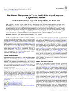 The aim of this study was to evaluate the use of photovoice in health education programs designed for young people. Methodology: Nine electronic databases were systematically searched and screened using specific predetermined criteria. Data, such as intervention characteristics, methodology, and analysis, were extracted and narratively analyzed. Results: A total of 96 studies were included. Photovoice was used in a wide variety of health programs such as obesity prevention and physical activity promotion. Thematic analysis was generally used to analyze the use of photovoice; other measures of effectiveness and impact were rare. Conclusion: Visual methods such as photovoice are emerging as a valuable tool to use when delivering health education programs to young people. It is critical that photovoice is chosen and adapted to suit participant needs in order to optimize engagement within the project.