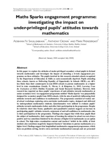the Evaluation of DEIS. Dublin: Economic and Social Research Institute). However, little research has reported on these pupils’ experiences of and attitudes towards mathematics at senior secondary level. An engagement programme entitled ‘Maths Sparks’ was purposefully designed for secondary pupils from DEIS schools, with the aim of positively influencing their attitudes towards and confidence in mathematics. The programme consisted of weekly outof-school workshops exploring extra-curricular mathematics topics, designed and delivered by undergraduate mathematics students. Questionnaires were utilized to evaluate pupils’