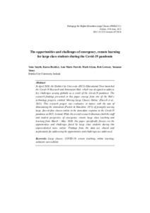 In April 2020, the Dublin City University (DCU) Educational Trust launched the Covid-19 Research and Innovation Hub, which was designed to address key challenges arising globally as a result of the Covid-19 pandemic. The research findings presented in this paper emerge from one of the Hub’s technology projects, entitled ‘Moving Large Classes Online’ (Farrell et al., 2021). This research project was evaluative in nature with the aim of illuminating the innovation (Parlett & Hamilton, 1972) of promptly moving large, face-to-face classes online in the immediate response to the Covid-19 pandemic at DCU, Ireland. While the overall research illustrates both the staff and student perspective of emergency, remote large class teaching and learning from March - May, 2020, this paper specifically focuses on the opportunities and challenges faced by large class students during this unprecedented move online. Findings from the data are shared and implications for addressing the opportunities and challenges are addressed.