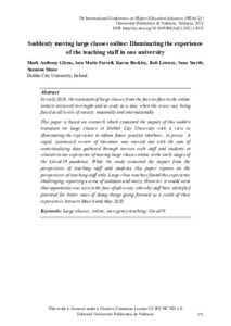 relation to our experience of moving large classes online in the early stages of the Covid-19 pandemic. While the study examined the impact from the perspectives of teaching staff and students, this paper reports on the perspectives of teaching staff only. Large class teachers found this experience challenging, reporting a sense of isolation and worry. However, it would seem that opportunity was seen in the face of adversity, whereby staff have identified potential for better ways of doing things going forward as a result of their experiences between March and May 2020