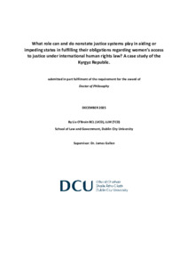 O'Broin, Lia (2026) What role can and do nonstate justice systems play in aiding or impeding states in fulfilling their obligations regarding women’s access to justice under international human rights law? A case study of the Kyrgyz Republic. PhD thesis, Dublin City University.