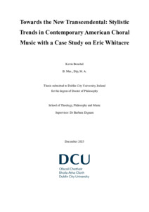 Despite the widespread popularity of this style of composition, its proponents have received little scholarly attention. The term ‘New Transcendentalism’ has been applied to the style, though it has not been established in research. This thesis presents analysis of select works by composers of New Transcendental music with a case study on Whitacre in order to identify the common musical features that link their works and to firmly establish New Transcendentalism as a term for this idiosyncratic style. Alongside interviews with the composers under review, a combinative approach incorporating Patricia Howland’s Integrated Parametric Structure Analysis and Critical Score Analysis is presented for illuminating the structure and compositional features of New Transcendental works, providing a basis for future scholarship on this emerging style of choral composition. Through comparative analysis of the music of Whitacre alongside works by Dale Trumbore (b. 1987), Jake Runestad (b. 1986), Dan Forrest (b. 1978), Marques L.A. Garrett (b. 1984), and Susan LaBarr (b. 1981), alongside interviews with the composers under review, this research highlights developments in New Transcendentalism beyond its two epochal figures, inviting further research into this new approach to choral composition.