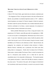 This article considers Austin Clarke’s Mnemosyne Lay in Dust (1966), in terms of Julia Kristeva’s psychoanalytic theory of abjection. It proposes a revised model of the poem’s structure based on the preoccupation with bodily boundaries and their transgression characteristic of this psychological state. Mnemosyne Lay in Dust is a poem of abjection, one which has an abject figure at its core, and is structured to reflect that abjection, not as a linear progress narrative but as an abject body, with its own imposed boundaries, constructed and sustained not by a sense of self but by a void. Where the progress narrative draws on the repressed power of pollution to achieve its forward propulsion, Clarke’s poem dramatises the abject. He presents us with numerous abject figures and represents the struggles of the abject with the linguistic, social ‘symbolic’. Through the partial, provisional ‘recovery’ of its protagonist from his mental breakdown, the poem shows how abjection is retained as a prop for the symbolic. Through immersion in, rather than repression of, the abject, Clarke’s poem supplies the signs by which the petrified self is restored to life.